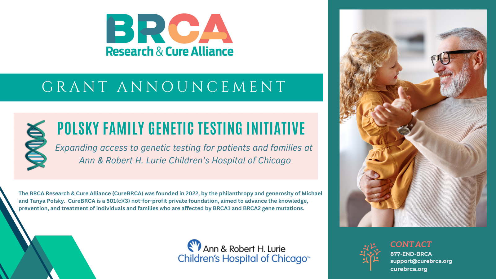The BRCA Research & Cure Alliance (CureBRCA) is thrilled to announce its new five-year partnership with Ann & Robert H. Lurie Children’s Hospital of Chicago to initiate the Polsky Family Genetic Testing Initiative. This collaboration will expand access to vital genetic testing for patients and families, with an estimated 275 individuals benefiting through the Cancer Predisposition Program in Lurie Children’s Center for Cancer and Blood Disorders. This partnership helps to fulfil CureBRCA’s mission by improving the lives of children and families affected by genetic mutations.